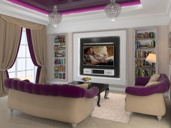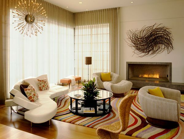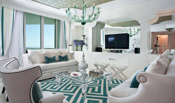 Хотя стиль Art-deco практически неограничен в выборе цветовой гаммы, стоит остановиться на двух-трёх оттенках. Например, выкрасить стены краской пастельного оттенка, на пол постелить светлый ламинат и персидские однотонные ковры, а мягкую мебель, ниши или полки, портьеры и прочие аксессуары выполнить в контрастной палитре, используя несколько оттенков одного и того же цвета.