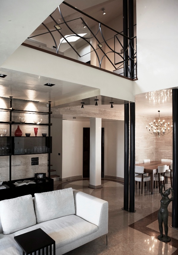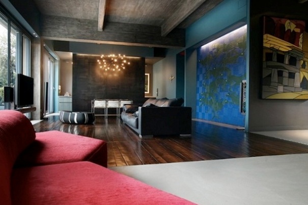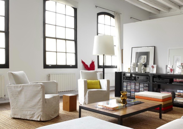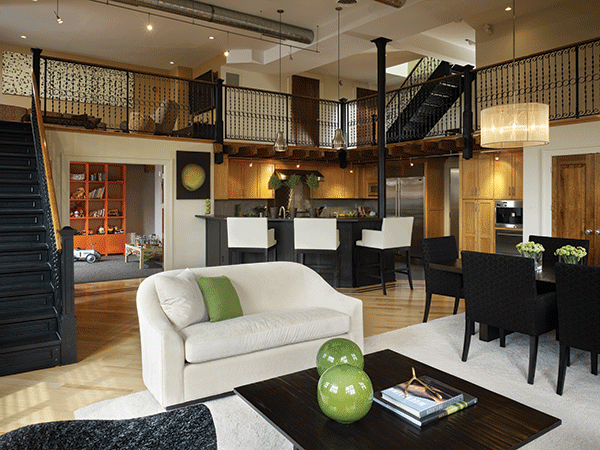 Важнее всего в гостиной в стиле лофт совместить прошлое, настоящее и будущее. В качестве «прошлого» могут выступить мраморные колонны, бетонные стены или потолок, чья многоуровневость достигнута при помощи необработанных деревянных балок. Роль «настоящего» вполне успешно сыграют перегородки из стекла и современная стереосистема. А вот «будущее» представят металлические детали и конструкции, а также трансформеры: кресла и столики на колёсах, разборной диван в виде кубиков и т.д. При первом взгляде на гостиную в стиле лофт должно складываться впечатление, что она «дышит», «движется» и при любом удобном случае «мобилизуется».