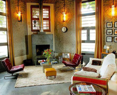 Предполагает ли гостиная в стиле лофт камин? Конечно! Это может быть старинный очаг из кирпича под дрова или современная бетонная колонка с металлической трубой. И не нужно придвигать камин к стене – поместите его прямо в центре комнаты.