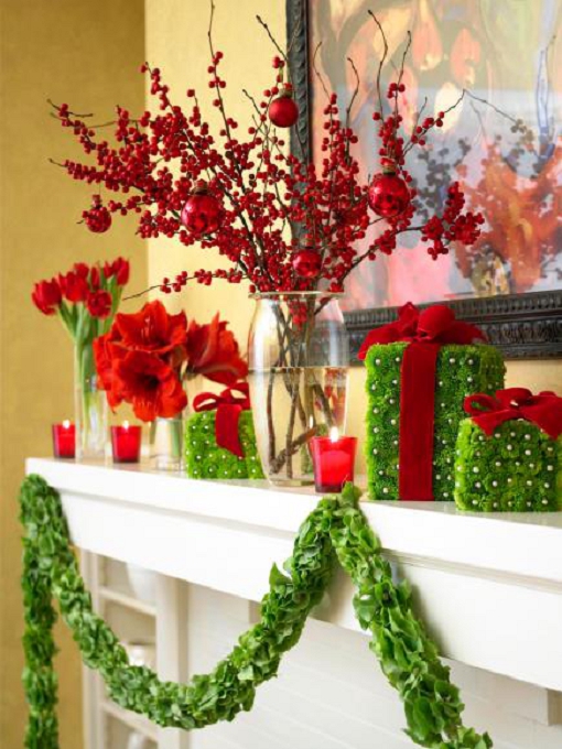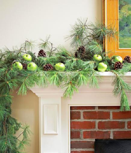 Периметр камина декорируйте гирляндой из тех же материалов, что и венок. Лучше, если эти два элемента будут выполнены в едином стиле. Но не слишком гонитесь за оригинальностью. Всё же традиционные детали, такие, как чулки для подарков, должны присутствовать.