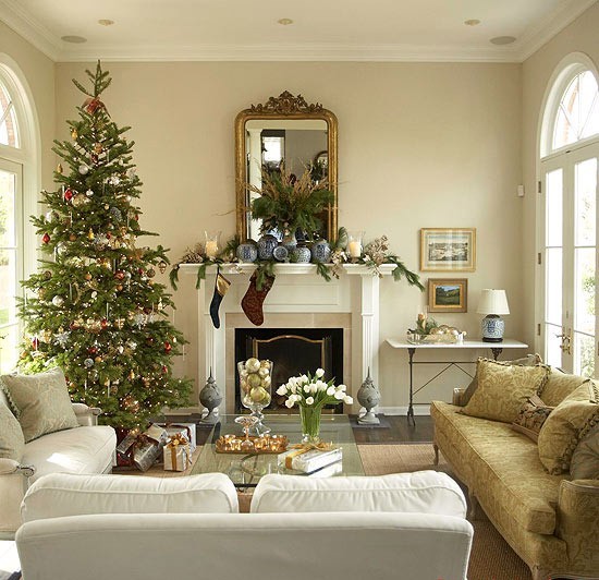 Если в помещении есть камин, ему нужно уделить особое внимание. Этот элемент, наравне с ёлкой, играет важную роль в новогоднем интерьере. Вот где можно проявить фантазию! Если вы избрали искусственную ель, то необходимо сделать очаг оплотом натуральности. Поместите на каминную полку тарелки с композициями из свечей, шишек, колокольчиков и еловых (натуральных) ветвей. Также можно посадить туда фигурки лошадок, голубей и ангелочков.