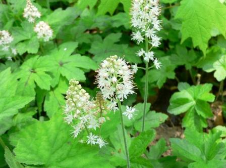 Tiarella или Тиарелла – травянистый многолетник с округлыми или сердцевидными листьями. Отлично укореняется в тени. Создает плотную подушку из листьев, над которой словно облачка парят светло-сиреневые и розовые цветы.